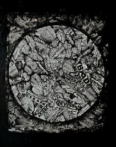 Breaking News offers a glimpse into a fractured world. Torn and layered newspaper fragments—stories of war, corruption, and human suffering—reflect the brokenness of life as it is often experienced and reported.